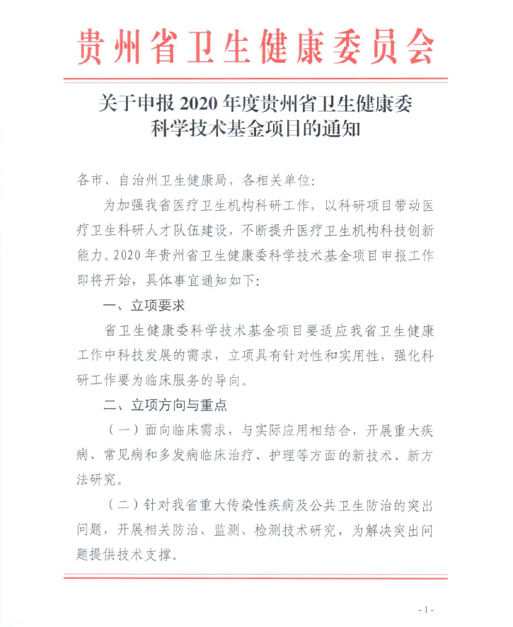 現(xiàn)接到貴州省衛(wèi)健委《關(guān)于申報(bào)2020年度貴州省衛(wèi)生健康委科學(xué)技術(shù)基金項(xiàng)目的通知》,2020年度貴州省衛(wèi)健委科學(xué)技術(shù)基金項(xiàng)目將于4月20日至5月20日進(jìn)行網(wǎng)上申報(bào),現(xiàn)將相關(guān)內(nèi)容通知如下,請(qǐng)各科室積極組織申報(bào)。
